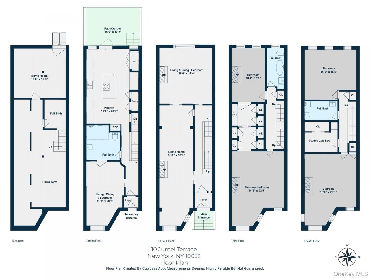 A landmark townhouse directly facing the Morris-Jumel MansionA rare opportunity to own a meticulously preserved corner single-family townhouse on iconic Jumel Terrace, one of NYC's most storied and architecturally significant residential enclaves.Designed in 1896 by architect Henri Fouchaux for William W. Watkins, this Romanesque Revival residence is the largest of just five landmarked homes lining the peaceful cobblestone street within the Jumel Terrace Historic District.The home sits directly across from the protected parkland surrounding the Morris-Jumel Mansion, ensuring permanent open views, with Sylvan Terrace just steps away.Spanning approximately 3,500 square feet across four full floors, plus an approximately 800-square-foot finished basement, the home offers generous scale and flexibility across its levels. Measuring roughly 18 feet in width, it sits on a 17.75-foot by 100-foot lot with building dimensions of approximately 17.75 feet by 58 feet and showcases exceptional original detail throughout. Annual property taxes are $11,411.The parlor level offers a gracious sequence of formal living and dining rooms defined by soaring ceilings, bay windows, and beautifully preserved woodwork. 5 decorative fireplaces with original tiled surrounds and carved wood mantels anchor the home's historic character, complemented by pocket doors, wainscoting, stained glass, and wood shutters reflecting late nineteenth-century craftsmanship.The garden level features a living and dining area, an eat-in kitchen with granite countertops, an externally vented range hood, and two large pantry cupboards, and a full bathroom, with direct access to the rear patio and garden. The approximately 600-square-foot garden includes mature plantings creating a private outdoor retreat ideal for dining and entertaining.Upper floors house 4 additional bedrooms, bringing the total to 5 bedrooms, including a primary suite with a dressing room featuring original oak cabinetry. A skylit study with a loft bed adds flexibility for work or guests. Three skylights enhance natural light throughout. In total, the home offers 4 finished full bathrooms, including an en suite, thoughtfully renovated to respect the historic fabric while providing modern comfort. Two bathrooms feature Japanese Toto bidet toilets.The finished lower level is arranged into distinct zones including a home gym, media room, storage, and a full bathroom with a six-jet and rain shower, adding spa-like functionality rarely found in a townhouse of this era.The home's orien