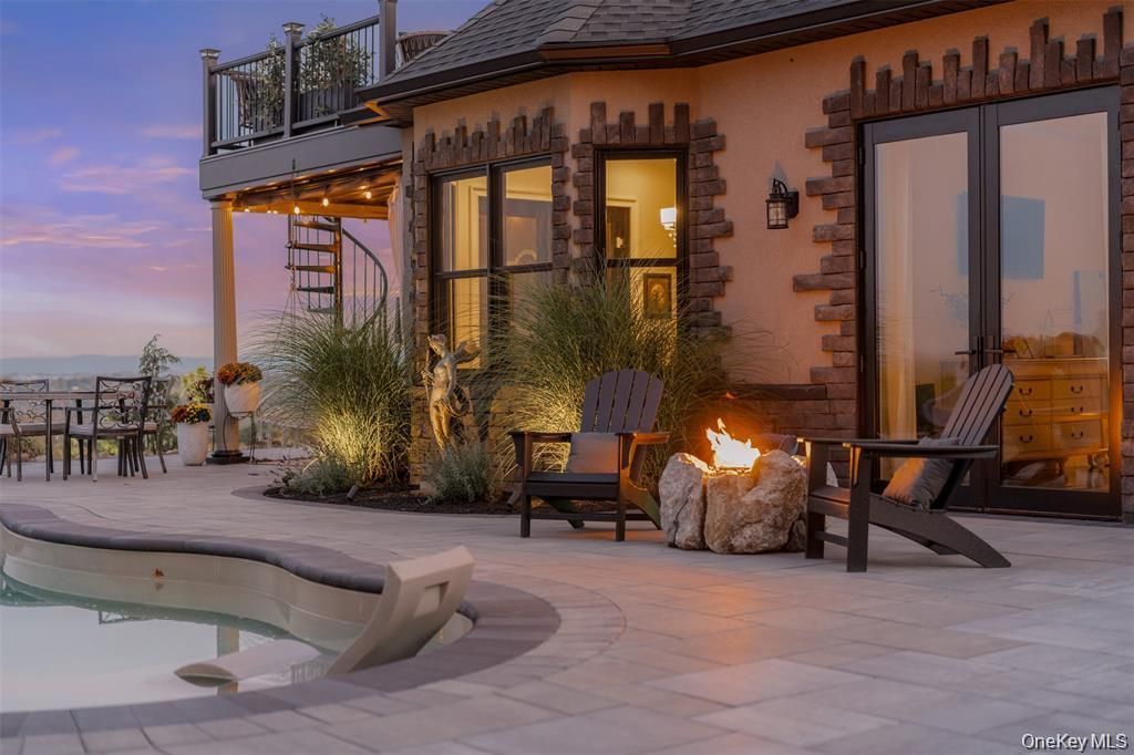 Perched high above the Hudson River with panoramic views set on 3.9 private acres, this custom-designed single-level estate embodies refined modern luxury. Clean architectural lines, dramatic finishes, and meticulously curated details create a residence that feels both sophisticated and effortlessly livable. The current layout lives spaciously, with the flexibility to easily convert to additional bedrooms, offering additional versatility without compromising the home's elegant flow.A custom entry door opens to a striking foyer that leads into a sun-drenched chef's kitchen designed for both everyday living and elevated entertaining. Quartz countertops, bespoke cabinetry, an oversized statement island, pot filler, gas range, wine refrigerator, and expansive prep space anchor the room. The open-concept design continues into a light-filled dining area and expansive living room, where floor-to-ceiling accordion glass doors fully disappear to reveal uninterrupted Hudson River views and breathtaking east-facing sunrises.The outdoor experience is nothing short of resort-like. Thoughtfully designed across lush landscaped grounds, the property features a stunning inground pool with water features and slide, a stacked-stone outdoor bar with changing room and bath, a custom-built fireplace, hot tub, sauna, and outdoor shower. A romantic secret garden retreat with its own fireplace and starlit patio offers a private sanctuary, while the grounds also include a playground, vineyard with grapevines and fruit trees, a detached barn, and beautifully hand-laid stone walls that weave throughout the property. Multiple terraces, a covered porch, and a Juliet spiral staircase with balcony create countless vantage points to take in the landscape and river beyond.Inside, a spacious guest bedroom shares a beautifully appointed full bath, while the luxurious primary suite serves as a serene retreat with private exterior access, a spa-inspired bath with double vanity and rainfall shower, and an expansive walk-in closet. A two-car garage provides ample space for vehicles and storage, while a walk-up partially finished attic offers the opportunity for a den, office, or additional living space.Privately gated with extensive hardscaping and generous parking, this extraordinary Hudson River estate delivers a rare combination of architectural beauty, privacy, and lifestyle, with the added opportunity to easily convert to a three-bedroom configuration for those seeking additional space.