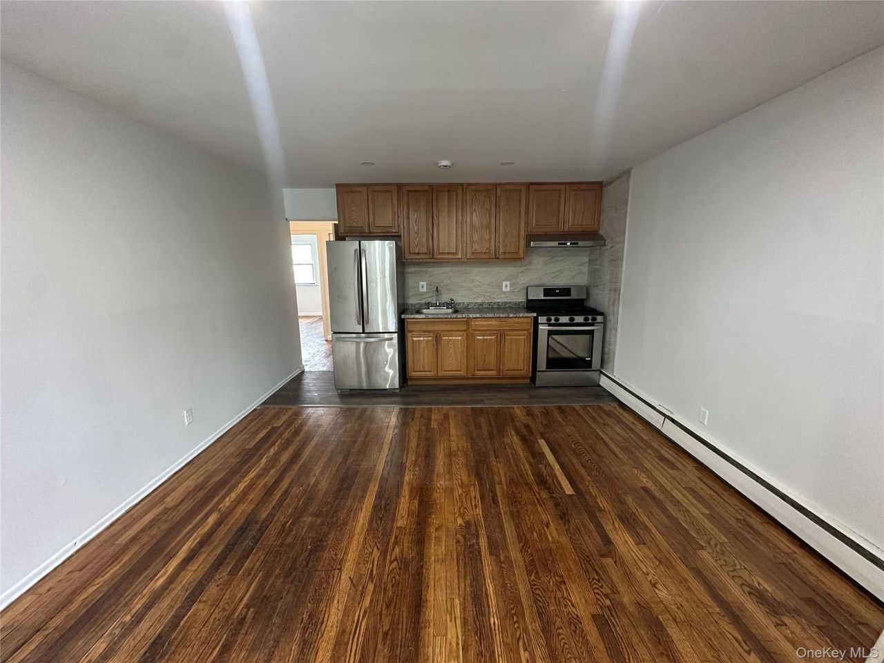 Updated first-floor rental unit located in West Hempstead, bordering Garden City. This residence features four bedrooms and one full bathroom. The interior includes a renovated kitchen equipped with wood cabinetry and stainless steel appliances, including a double-door refrigerator, gas range, and built-in microwave.Hardwood flooring is present throughout the living area and all bedrooms. The bathroom is modernized with contemporary tiling and updated fixtures. Large windows and recessed lighting provide ample natural and overhead light.These images have been virtually staged to enhance prospective.