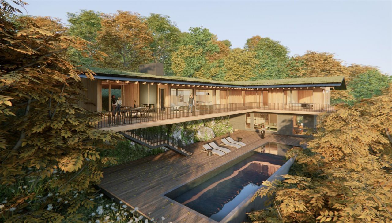 This exceptional mountain property showcases innovative architectural design that respects and enhances its natural setting. This 3,100 square foot home offers sophisticated living spaces with direct connection to the surrounding landscape. The main living area runs parallel to the natural slope, partially integrated into the terrain for energy efficiency and protection. Floor-to-ceiling triple-pane sliding glass doors open completely to create a seamless transition between indoor comfort and outdoor living, with panoramic mountain views from every angle. The primary suite occupies a premium position extending outward from the main structure, providing exceptional privacy and commanding views. Its private deck creates an elevated vantage point above the tree canopy toward distant mountain peaks. With three bedrooms, three and a half baths, and a versatile den that can function as a fourth bedroom, the home accommodates guests with ease. The thoughtful floor plan balances communal spaces with private retreats. Premium materials throughout include warm cedar cladding and architectural concrete elements that complement the natural surroundings while providing exceptional durability and minimal maintenance. Kaaterskill House represents a rare opportunity to own a significant architectural property that delivers both everyday livability and a meaningful connection to the mountain landscape. Modern luxury meets natural beauty in this thoughtfully designed mountain retreat.