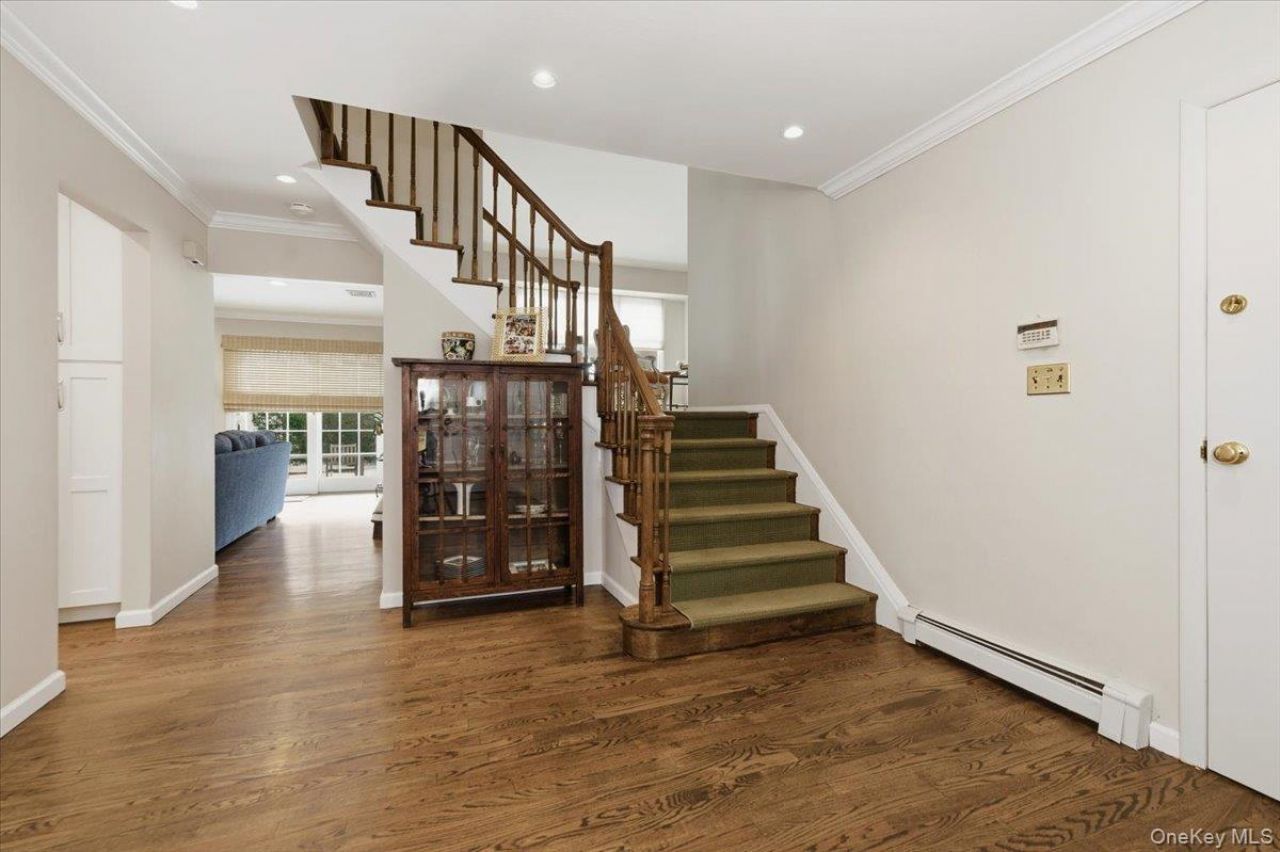 Welcome to this beautifully maintained splanch-style home offering the perfect blend of space, style, and functionality. The inviting double-door entry welcomes you into a bright foyer featuring a convenient powder room. The formal dining room seamlessly opens to the updated kitchen, showcasing quartz countertops, white paneled wood cabinetry, and a spacious pantry-ideal for both everyday living and entertaining.Just beyond the kitchen, the warm and inviting family room features a charming wood-burning fireplace and sliding glass doors that lead to a fully fenced backyard, perfect for outdoor gatherings and relaxation. A half flight up, the elegant formal living room boasts cathedral ceilings and a stunning wall of windows that flood the space with natural light while offering beautiful views of the property.The upper level features four generously sized bedrooms, including a spacious primary ensuite, three additional guest bedrooms, and a full guest bath. A striking wooden banister connects all three levels, complementing the beautiful hardwood floors that run throughout the home.Additional highlights include a partial basement offering storage and laundry space, an attached one-car garage, leased solar panels for energy efficiency, and a multi-car driveway. This home truly offers a complete package of comfort, design, and convenience. Close Proximaty to beautiful Baldwin Park.